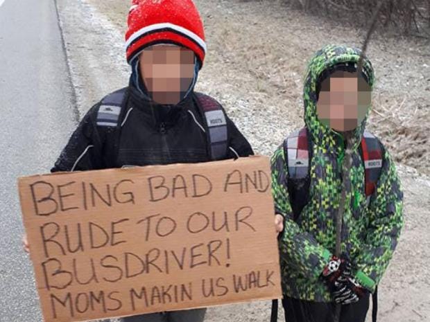 It bore the words: “Being bad and rude to our bus driver! Moms makin us walk."