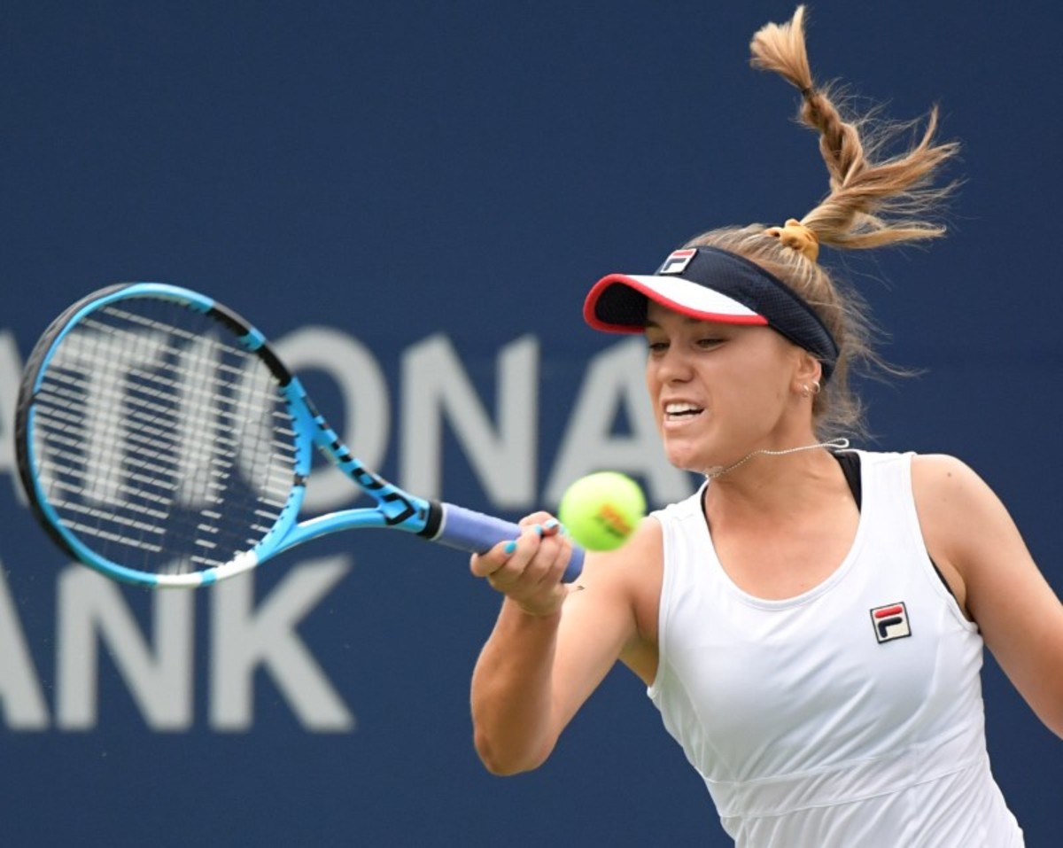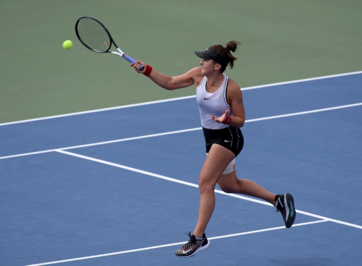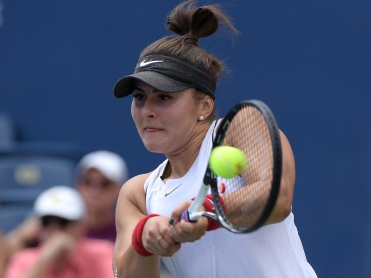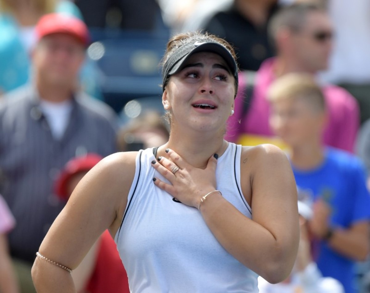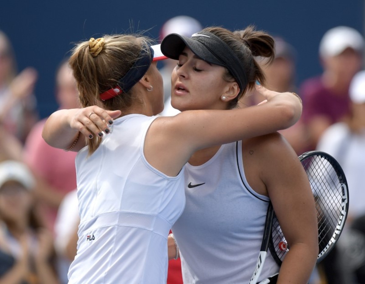 Aug 10, 2019; Toronto, Ontario, Canada; Bianca Andreescu (Canada, right) embraces Sofia Kenin (USA) after defeating her to advance to the finals of the Rogers Cup tennis tournament at Aviva Centre. Mandatory Credit: Dan Hamilton-USA TODAY SportsAug 10, 2019; Toronto, Ontario, Canada; Sofia Kenin (USA) plays a shot against Bianca Andreescu (Canada)during the Rogers Cup tennis tournament at Aviva Centre. Mandatory Credit: Dan Hamilton-USA TODAY SportsAug 10, 2019; Toronto, Ontario, Canada; Bianca Andreescu (Canada) plays a shot against Sofia Kenin (USA) during the Rogers Cup tennis tournament at Aviva Centre. Mandatory Credit: Dan Hamilton-USA TODAY SportsAug 10, 2019; Toronto, Ontario, Canada; Tennis fans show support for Bianca Andreescu (Canada during her semi-final win over Sofia Kenin (USA) in the Rogers Cup tennis tournament at Aviva Centre. Mandatory Credit: Dan Hamilton-USA TODAY SportsAug 10, 2019; Toronto, Ontario, Canada; Bianca Andreescu (Canada) plays a shot against Sofia Kenin (USA) during the Rogers Cup tennis tournament at Aviva Centre. Mandatory Credit: Dan Hamilton-USA TODAY SportsAug 10, 2019; Toronto, Ontario, Canada; Sofia Kenin (USA) plays a shot against Bianca Andreescu (Canada)during the Rogers Cup tennis tournament at Aviva Centre. Mandatory Credit: Dan Hamilton-USA TODAY SportsAug 10, 2019; Toronto, Ontario, Canada; Bianca Andreescu (Canada) reacts to winning a point against Sofia Kenin (USA) during the Rogers Cup tennis tournament at Aviva Centre. Mandatory Credit: Dan Hamilton-USA TODAY Sports