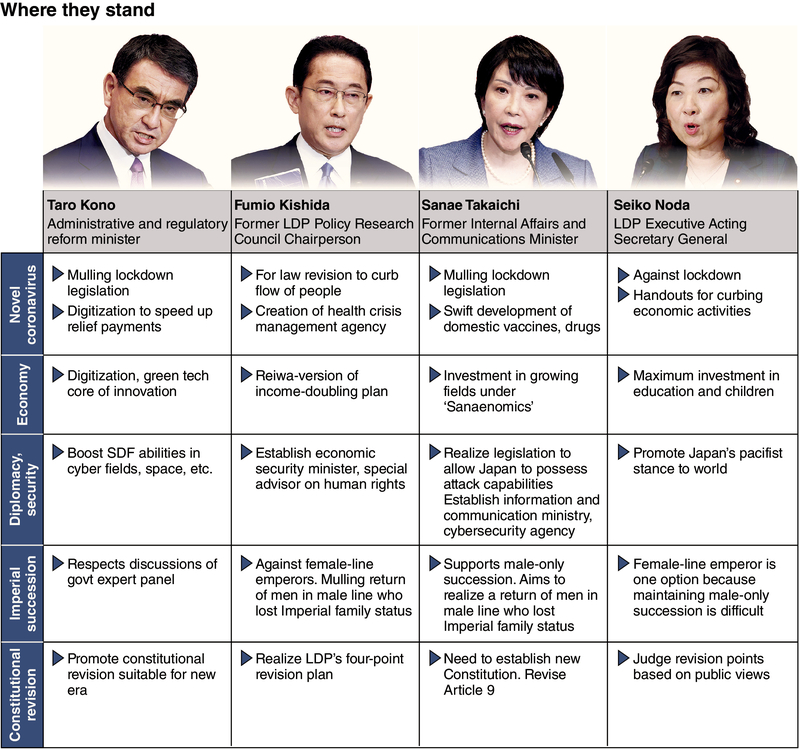 Regarding economic policy, Takaichi called for further acceleration of the Abenomics policy package advocated by former Prime Minister Shinzo Abe, while Kishida and Kono proposed some revisions.