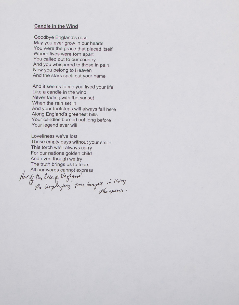 Taupin's typed and annotated rewritten lyrics of "Candle in The Wind," which John performed at Princes Diana's funeral in London in 1997, are expected to fetch about $10,000-$15,000 at the November auction in New York.