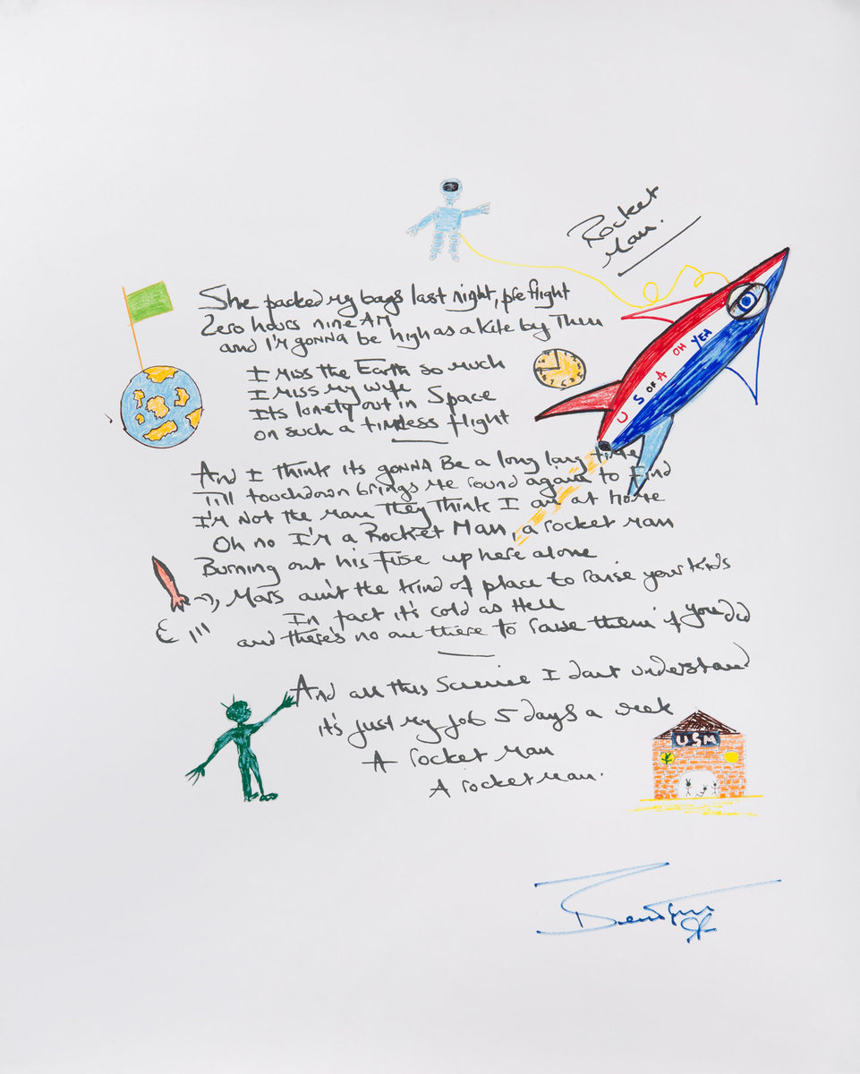 LOS ANGELES (Reuters) - The lyrics of some of Elton John's biggest hits - "Rocket Man," "I'm Still Standing," and the Princess Diana funeral version of "Candle in the Wind" - are going up for auction as the British musician's longtime collaborator clears out his archives.