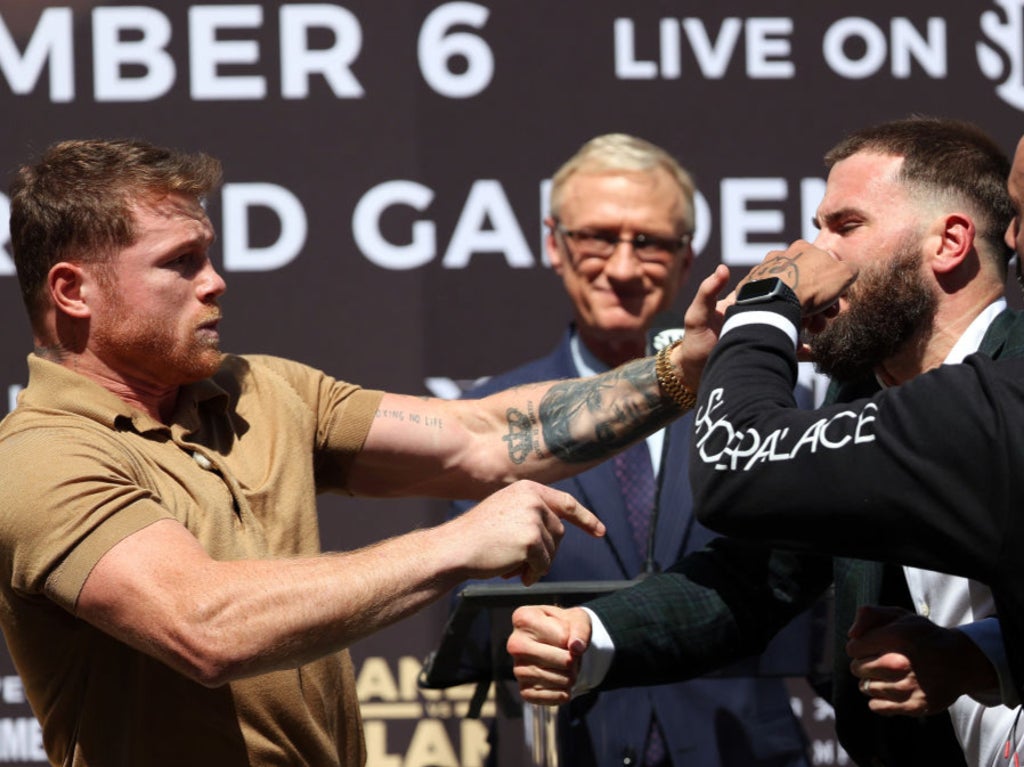 Canelo Alvarez and Caleb Plant dramatically swung punches at each other after the Mexican was labelled a “drug cheat” in a highly intense first face-off ahead of their clash on 6 November.
