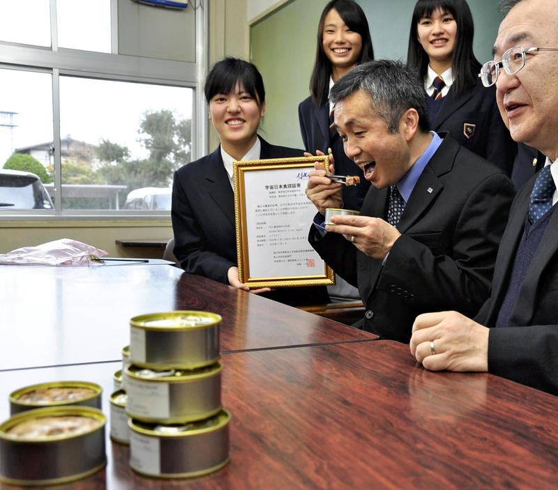 The high school began developing space foods 12 years ago with the aim of improving the production of canned mackerel and showing off mackerel as a local specialty.