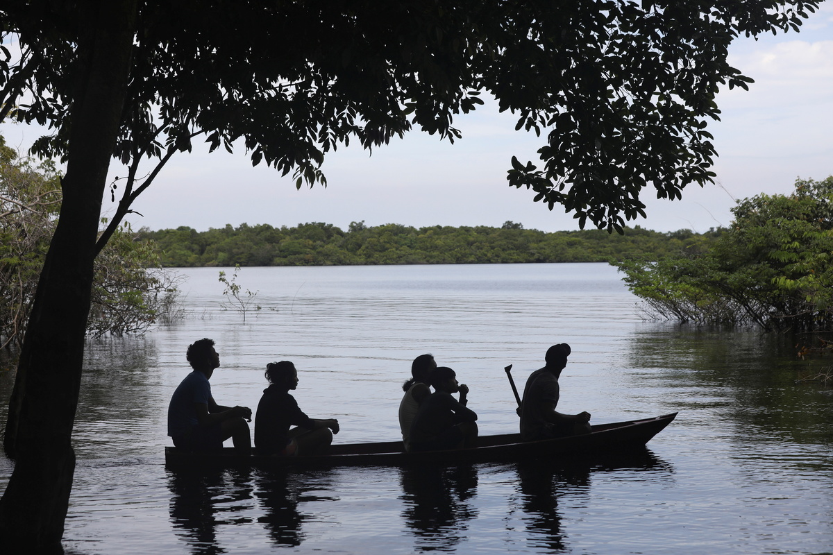 Indigenous siblings of the Kambeba ethnic group, 13-year-old Antonio Filho Pontes de Araujo, 15-year-old Thais Pontes de Araujo and 17-year-old Tailo Pontes de Araujo are seen in a canoe along with their parents, Antonio Lima de Araujo and Socorro Gomes Pontes in the Tres Unidos community where Ribeirinhos (river dwellers) and indigenous people, take part in a canoeing class as part of the Indigenous Canoeing project of the Brazilian Canoeing Confederation (CBCa) and the Sustainable Amazon Foundation (FAS) on Cueiras river, an affluent of the Negro River in Manaus, Amazonas state, Brazil, August 14, 2021. REUTERS/Bruno Kelly