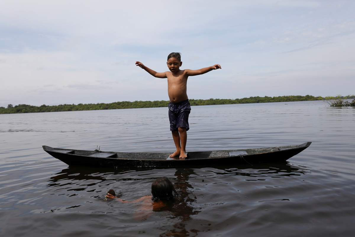 Indigenous children of the Kambeba ethnic group play in a canoe in Tres Unidos community where Ribeirinhos (river dwellers) and indigenous people, take part in a canoeing class as part of the Indigenous Canoeing project of the Brazilian Canoeing Confederation (CBCa) and the Sustainable Amazon Foundation (FAS) on Cueiras river, an affluent of the Negro River in Manaus, Amazonas state, Brazil, August 14, 2021. REUTERS/Bruno Kelly