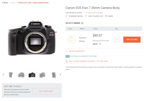 Because I was a weenie and didn’t want to get a bum camera on my first go, I decided to get a Canon EOS 7 in “Excellent” condition from KEH for about $200. This camera, which I compared to the EOS RP here, came out in 2000 and really does feel like any other Canon camera. I was able to start shooting with it almost immediately.