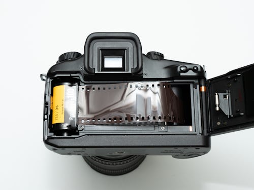 Okay, but what about physically loading the film? There’s a little switch you pull on the left-hand side that pops open the film door. Inside you’ll see a very standard looking film bay, but there is a lot of innovation at work here. Unlike earlier film cameras, Canon took away pretty much every point of user error, so there’s nothing you have to slot film into or sprockets you need to align, just lay the film over and you’re pretty much good to go. This is what they paid the big bucks for back in the day.