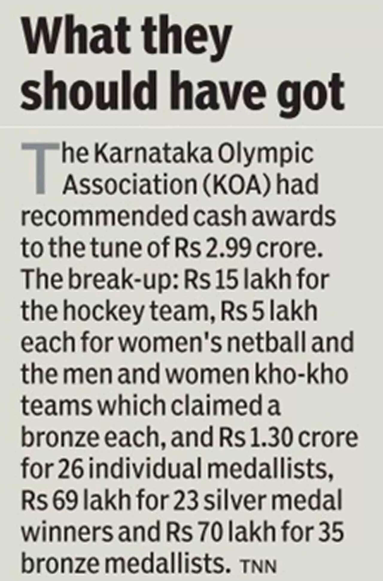 BENGALURU: A big increase in cash awards for medal-winning performance came with a rider. But not many Karnataka athletes knew about it.