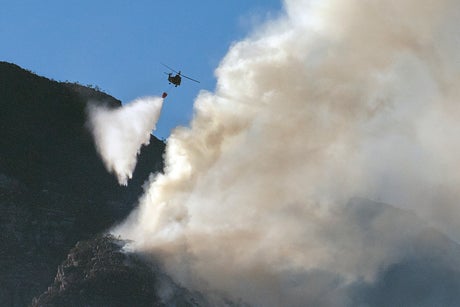 Fire-fighting helicopters were dropping water on areas where the fire still smoldered and smoked on the rocky peaks of Table Mountain. South African army choppers had joined the operation to support the fire department after the helicopters were all grounded Monday because of strong winds.