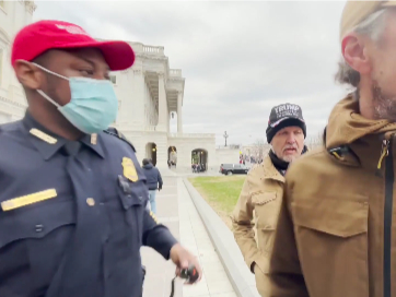 In a video of Mr Johnson at the riot, he can be seen calling for help and enlisting two men to to aid him on the east steps of the Capitol.
