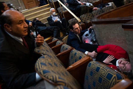 Mr Crow was determined not to leave anyone behind and he was the last to leave the chamber. He stretched out a comforting hand to his colleague Susan Wild of Pennsylvania after they were told by Capitol Police to get down and take cover as chaos reigned just outside the chamber door.