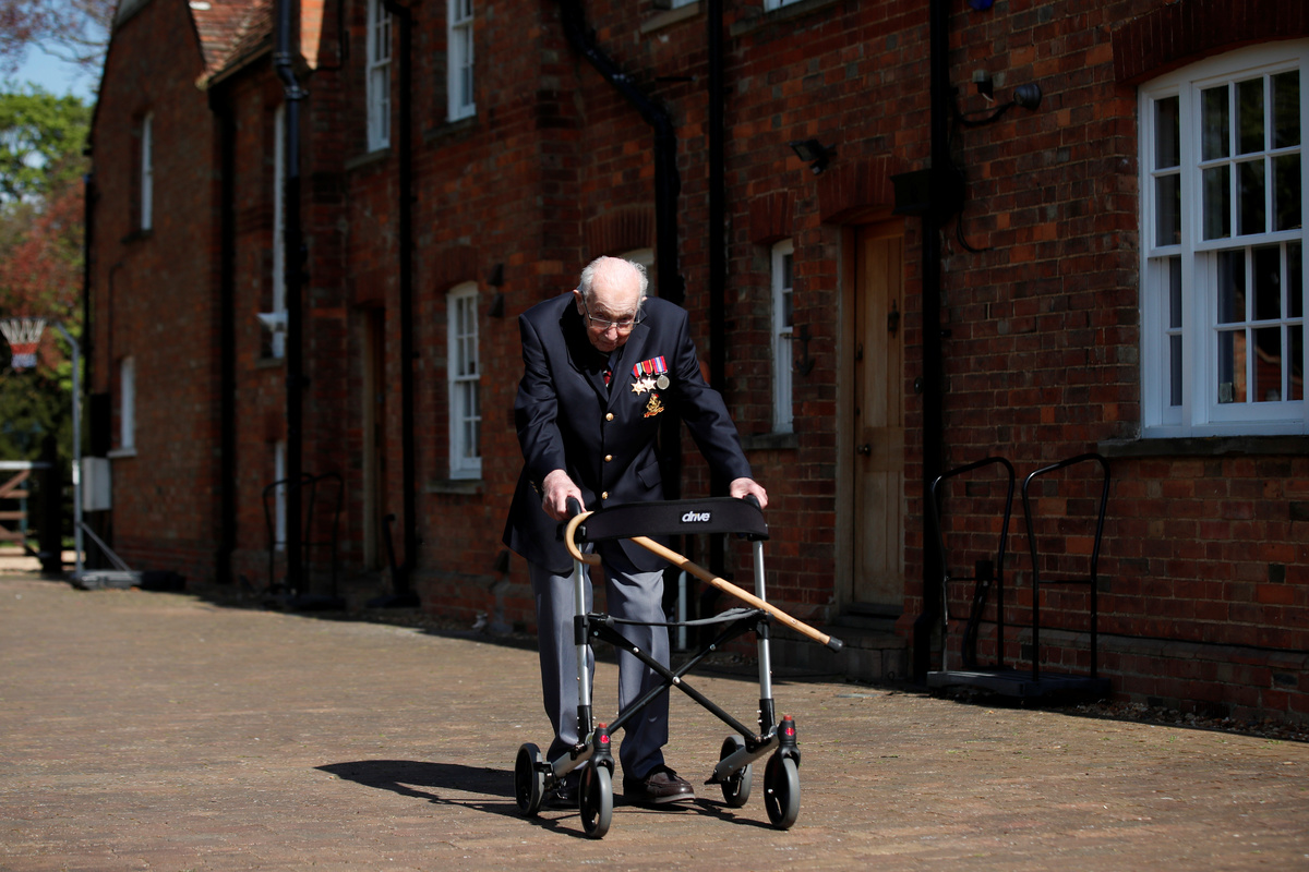 Retired British Army Captain Tom Moore, 99, walks to raise money for health workers, by attempting to walk the length of his garden one hundred times before his 100th birthday this month as the spread of coronavirus disease (COVID-19) continues, Marston Moretaine, Britain, April 15, 2020. REUTERS/Peter CziborraRetired British Army Captain Tom Moore, 99, walks to raise money for health workers, by attempting to walk the length of his garden one hundred times before his 100th birthday this month as the spread of coronavirus disease (COVID-19) continues, Marston Moretaine, Britain, April 15, 2020. REUTERS/Peter CziborraRetired British Army Captain Tom Moore, 99, poses after he continued to raise money for health workers, by attempting to walk the length of his garden one hundred times before his 100th birthday this month as the spread of coronavirus disease (COVID-19) continues, Marston Moretaine, Britain, April 15, 2020. REUTERS/Peter Cziborra