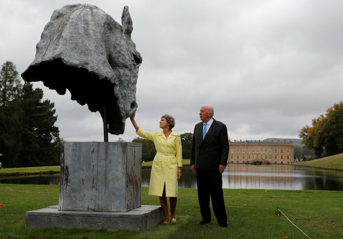 The Duke and Duchess of Devonshire look at a sculpture entitled "Into the Wind" by Nic Fiddian-Green during the Chatsworth Outdoors exhibition at Chatsworth House near Edensor, Britain September 12, 2018. REUTERS/Darren Staples