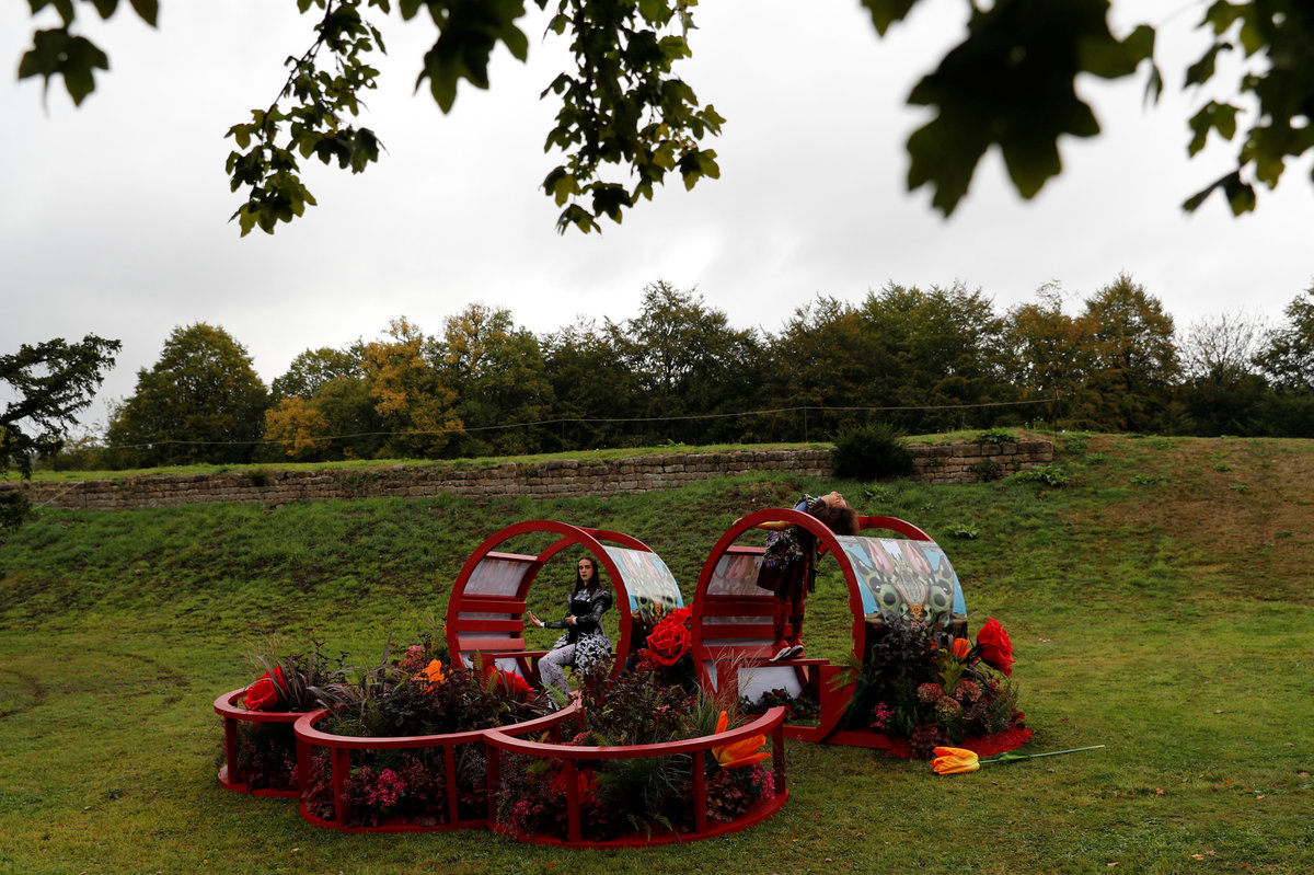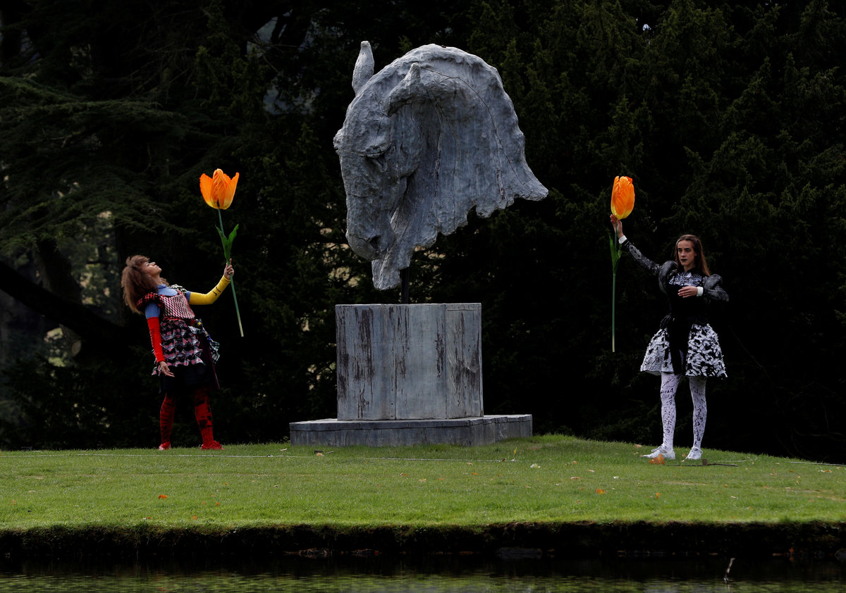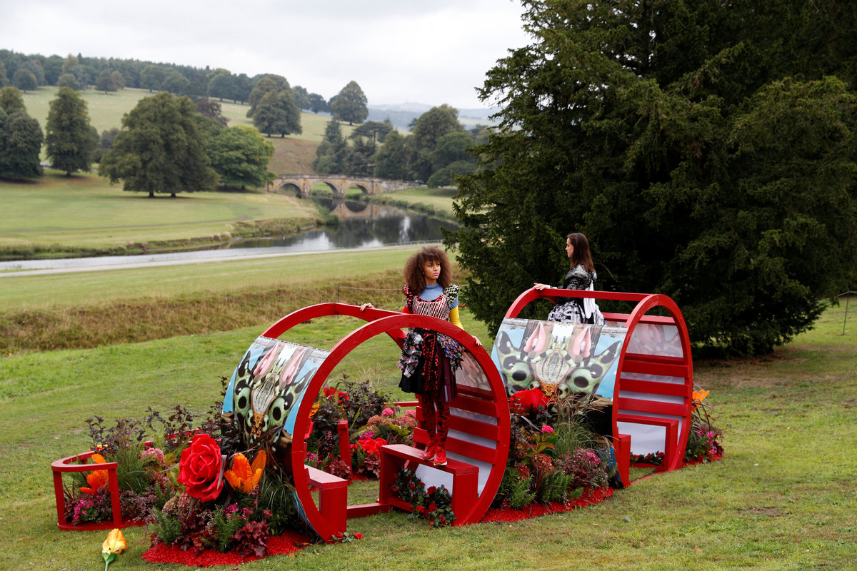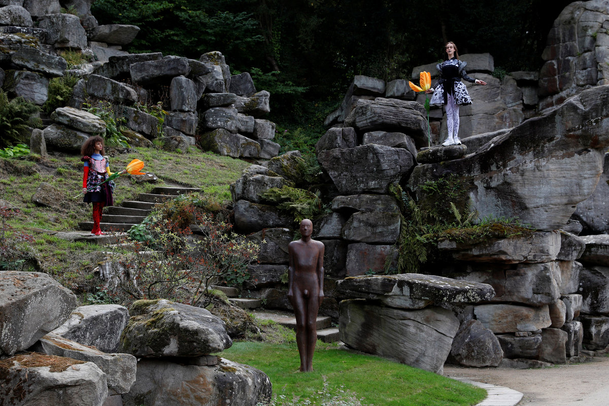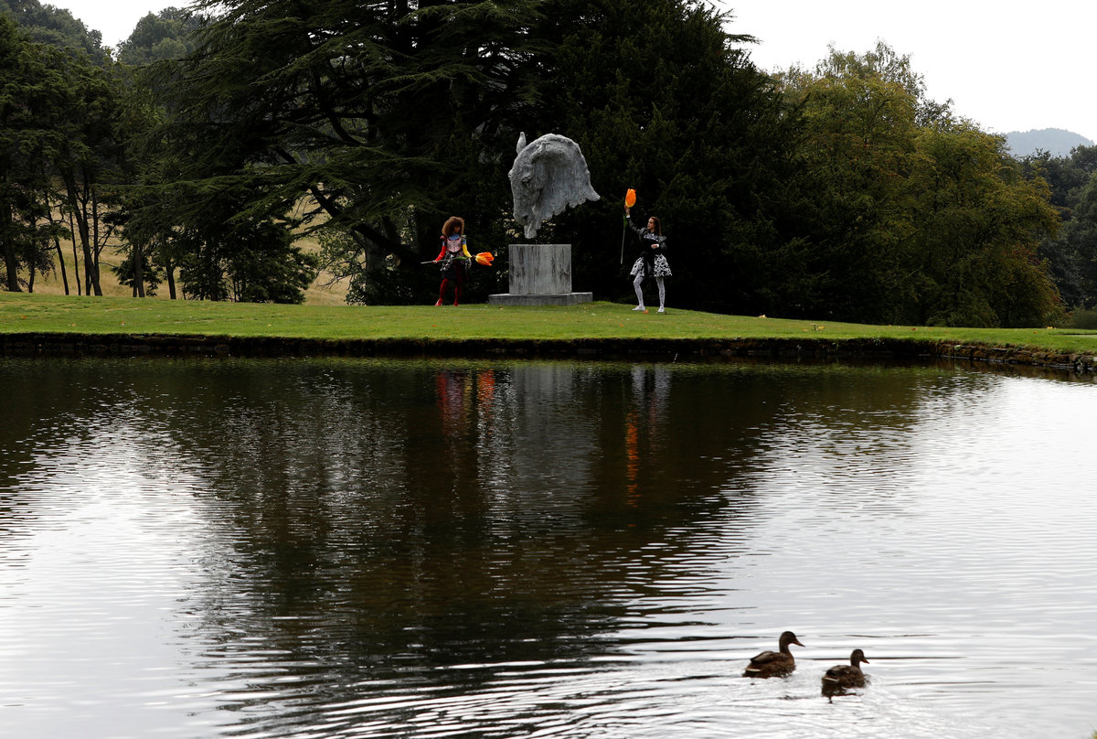 Dancers perform on an installation entitled "Bower of Bliss" during the Chatsworth Outdoors exhibition at Chatsworth House near Edensor, Britain September 12, 2018. REUTERS/Darren StaplesDancers perform next to a sculpture entitled "Into the Wind" by Nic Fiddian-Green during the Chatsworth Outdoors exhibition at Chatsworth House near Edensor, Britain September 12, 2018. REUTERS/Darren StaplesThe Duke and Duchess of Devonshire walk past a sculpture by Antony Gormley entitled "Learning to be I" during the Chatsworth Outdoors exhibition at Chatsworth House near Edensor, Britain September 12, 2018. REUTERS/Darren Staples