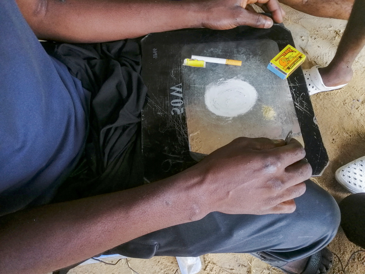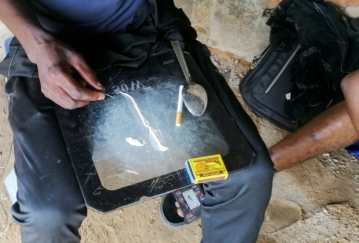 In an abandoned shack in a suburb of Kinshasa a young man seeking oblivion slits open a bag of brown powder, blending it with a couple of crushed pills using the back of a spoon, before snorting the "bombe" mixture, with his friends.