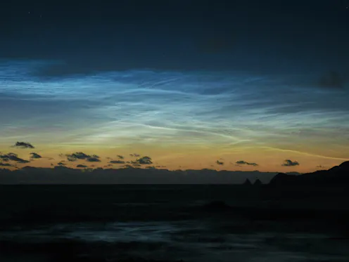 Noctilucent clouds are very rare – from Australian Antarctic stations we’ve recorded about ten observations since 1998. They occur at an altitude of about 80km in the polar regions during summer. You can only see them from the ground when the sun is below the horizon during twilight, but still shining on the high atmosphere.
