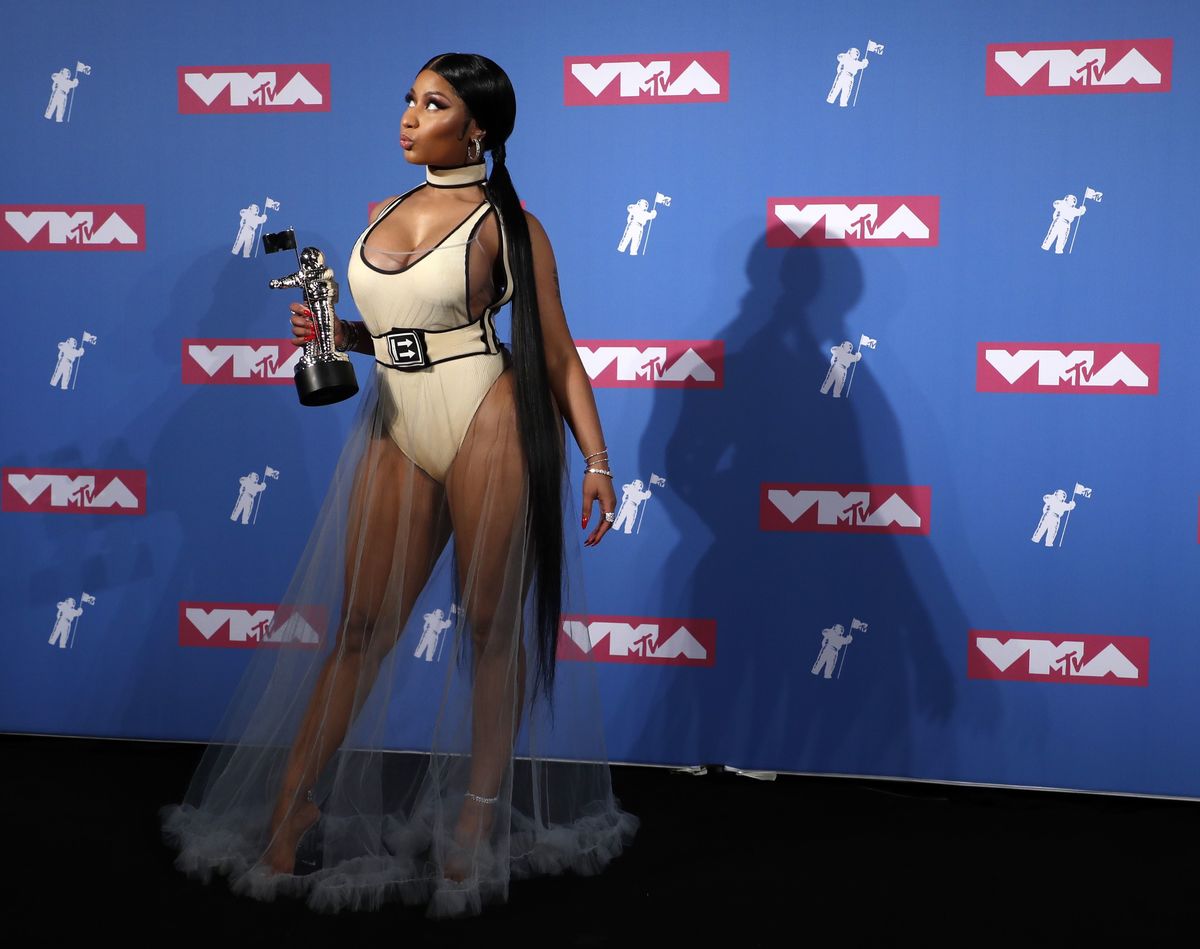 2018 MTV Video Music Awards - Photo Room - Radio City Music Hall, New York, U.S., August 20, 2018. - Rapper Nicki Minaj poses backstage with her Best Hip-Hop Video award for "Chun-Li." REUTERS/Carlo Allegri