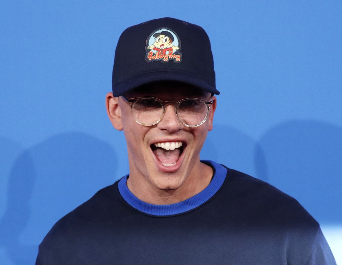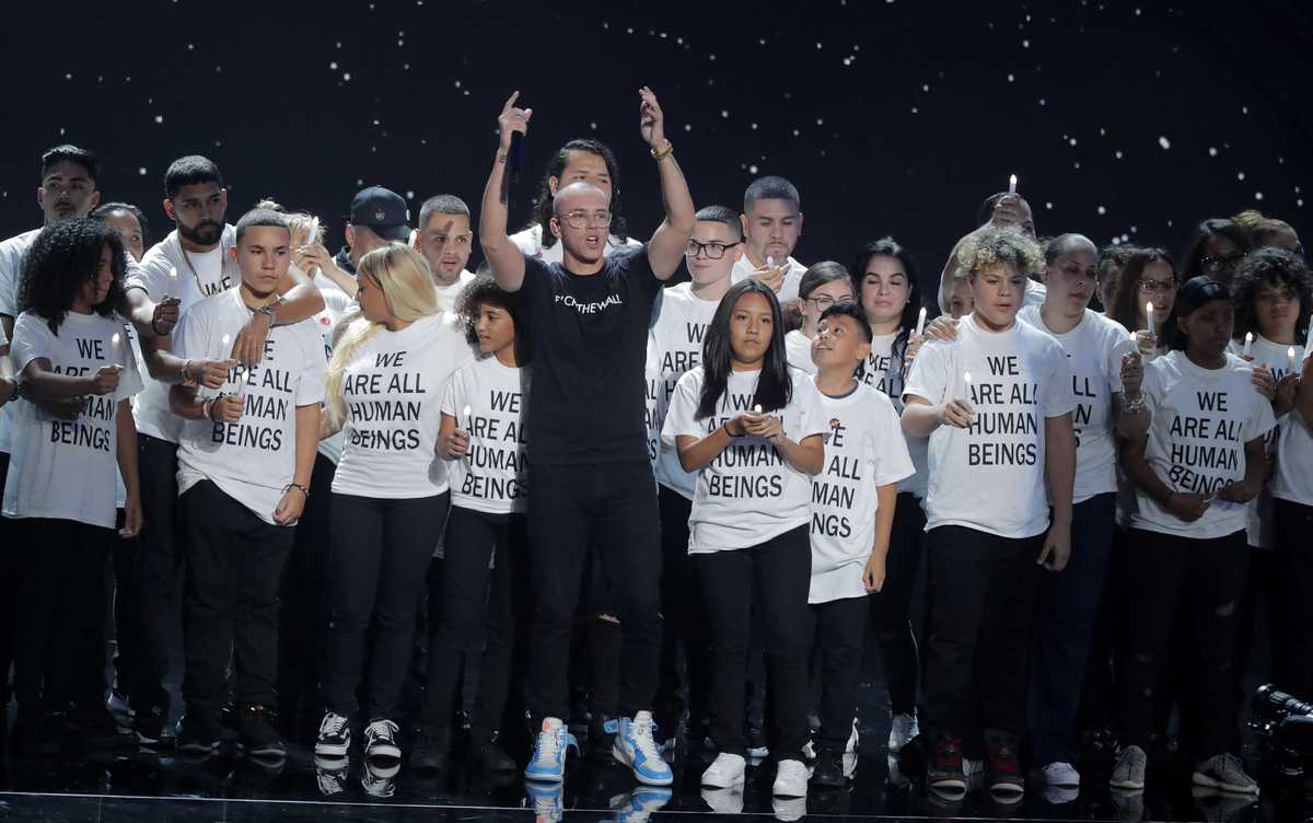 Rapper Logic was joined onstage by dozens of immigrant children and their families wearing white t-shirts saying "We are all human beings," for a performance of his song "One Day."