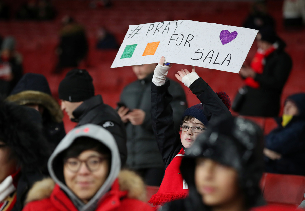 Soccer Football - Premier League - Arsenal v Cardiff City - Emirates Stadium, London, Britain - January 29, 2019 A fan holds up a sign as a tribute to Emiliano Sala before the match Action Images via Reuters/Peter Cziborra