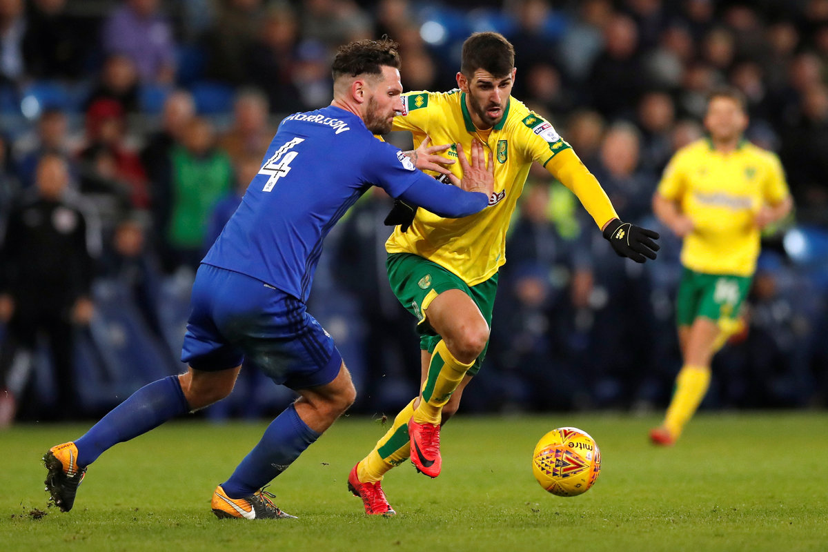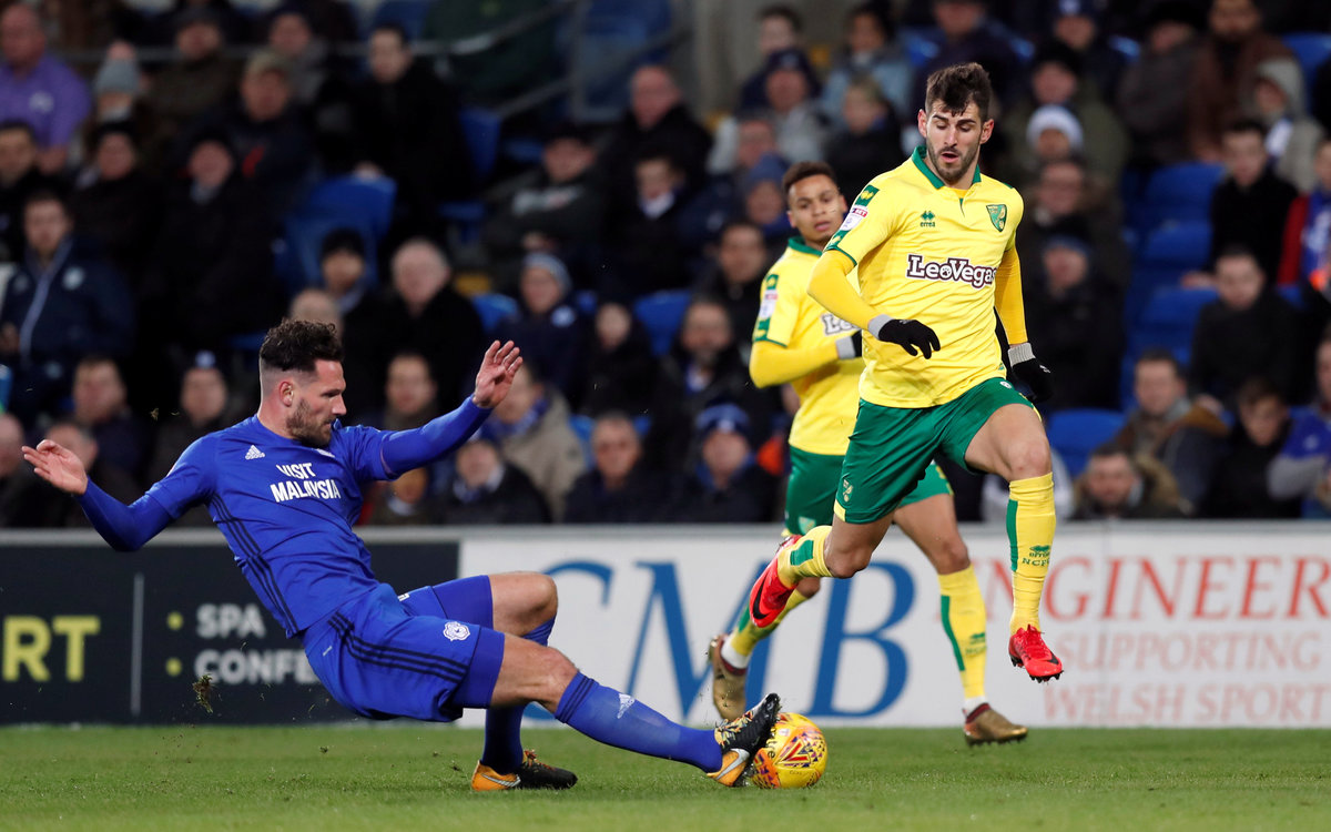 Soccer Football - Championship - Cardiff City vs Norwich City - Cardiff City Stadium, Cardiff, Britain - December 1, 2017 Cardiff's Sean Morrison in action with Norwich's Nelson Oliveira Action Images/Andrew Boyers