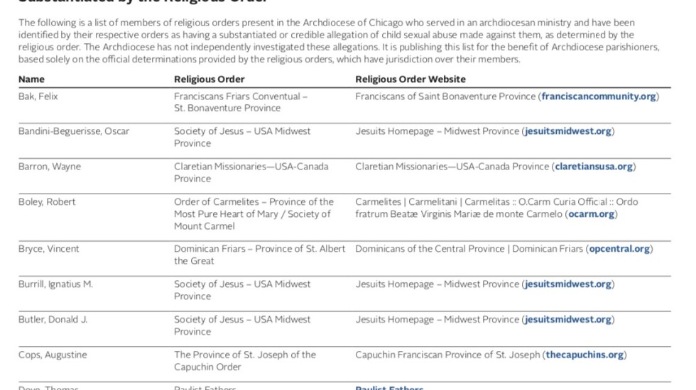 The men added to the list are described as “members of religious orders present in the Archdiocese of Chicago who served in an archdiocesan ministry and have been identified by their respective orders as having a substantiated or credible allegation of child sexual abuse made against them, as determined by the religious order.”