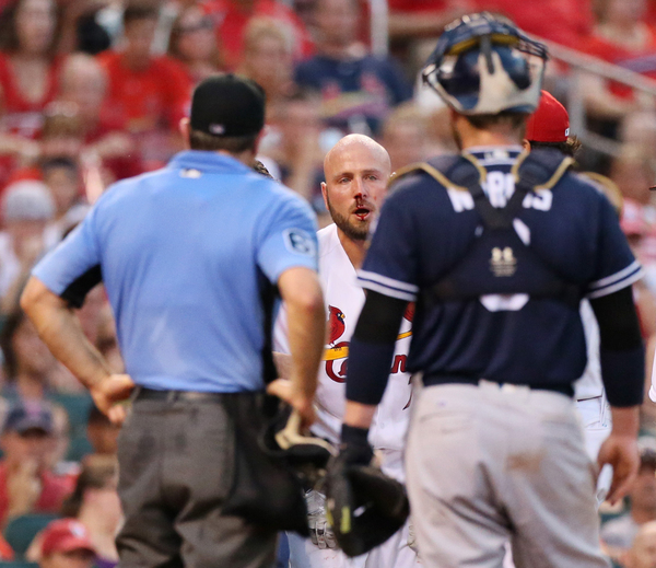 The offensive burst gave the bullpen some needed breathing room. After Adams' double scored Jedd Gyorko and Greg Garcia, Aledmys Diaz tripled to score Adams and Diaz scored on a single by Stephen Piscotty. In the sixth, Yadier Molina led off with a single and Randal Grichuk homered to left center, his 12th of the season, and then another from Jedd Gyorko, his eighth of the season. Gyorko, who played three seasons for the Padres before being traded to the Cardinals for Jon Jay in the offseason, has gone 9 for 14 against his old team this season, a .642 batting average.