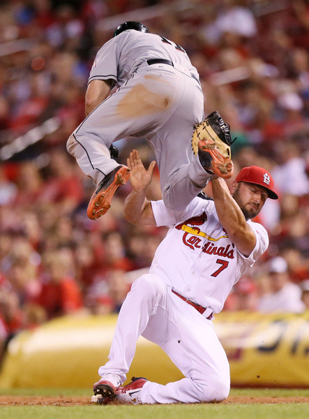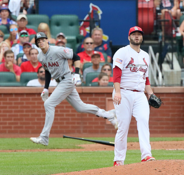 The first four Cardinals batters of the game got hits off Marlins starter Jeff Locke. Matt Carpenter, starting at second base for the first time this season, led off with a single and scored when Tommy Pham hit a triple in the following at bat. Pham then scored on a single hit by Stephen Piscotty.