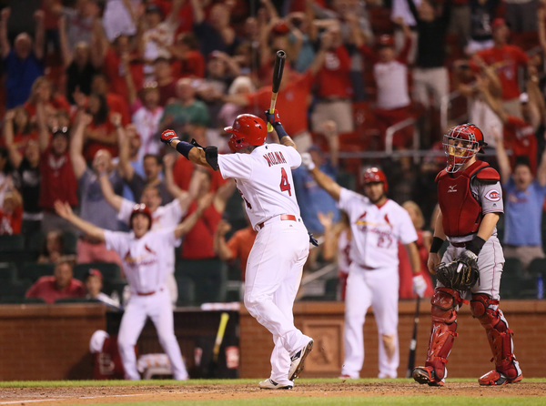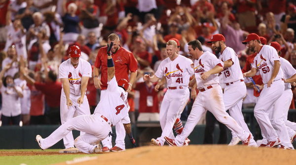 Then with the Busch Stadium crowd at its feet, Moss took ball four, tying the game at 4. The runners advanced 90 feet and when Molina was hit by Ohlendorf's pitch, the Cardinals had a win.