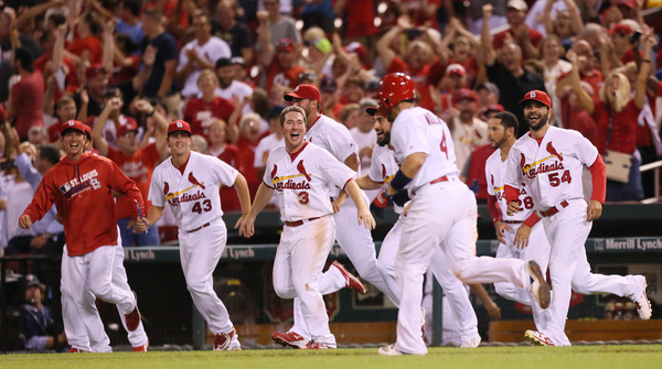 The Cardinals scored all five of their runs in the ninth inning. The crowd of 40,616, which didn't have much to cheer for throughout the night, celebrated an unusual walk-off win to cap off a 3-hour, 10-minute game.