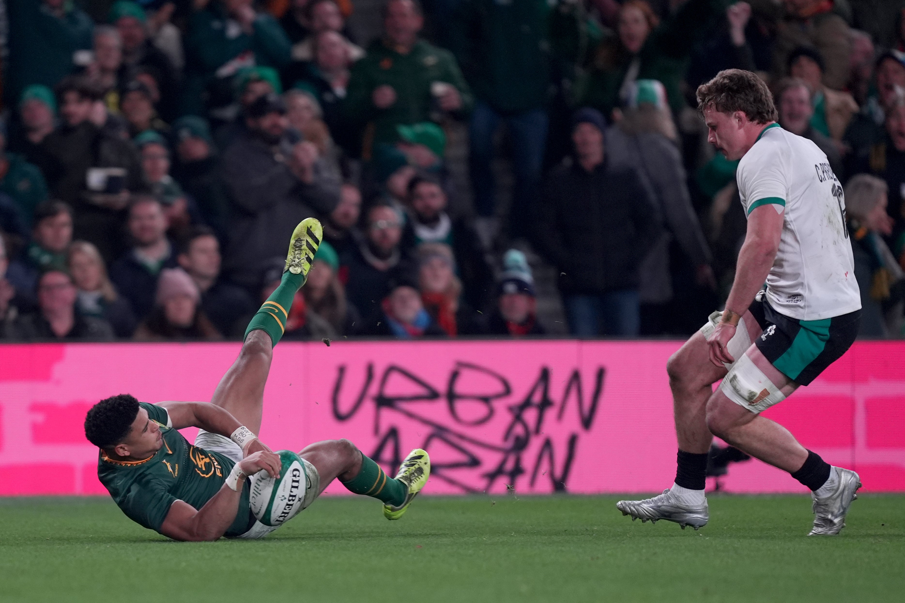 Feinberg-Mngomezulu burst past Jamison Gibson-Park in the 47th minute to further delight the sizeable Springbok contingent among the capacity crowd, in between penalties from Sam Prendergast.
