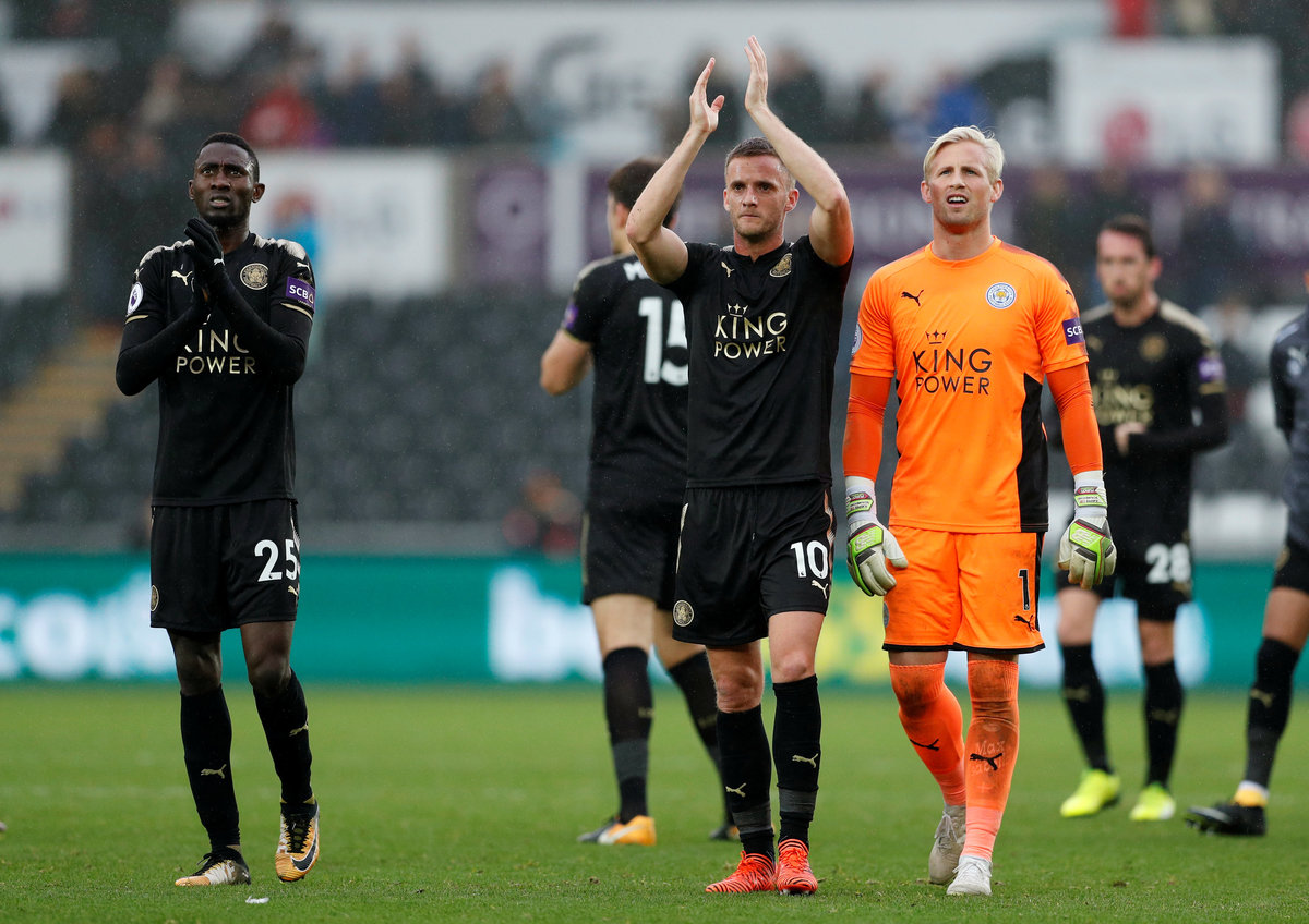 Soccer Football - Premier League - Swansea City vs Leicester City - Liberty Stadium, Swansea, Britain - October 21, 2017 Leicester City's Kasper Schmeichel, Wilfred Ndidi and Andy King celebrate after the match Action Images via Reuters/John Sibley