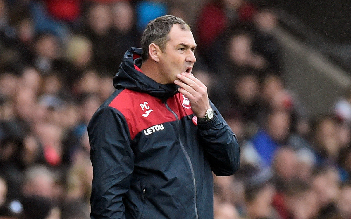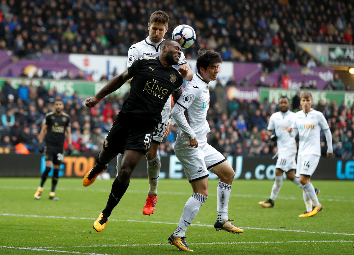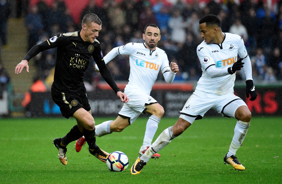 Soccer Football - Premier League - Swansea City vs Leicester City - Liberty Stadium, Swansea, Britain - October 21, 2017 Leicester City's Jamie Vardy in action with Swansea City's Martin Olsson and Leon Britton REUTERS/Rebecca Naden Soccer Football - Premier League - Swansea City vs Leicester City - Liberty Stadium, Swansea, Britain - October 21, 2017 Swansea City's Alfie Mawson scores their first goal REUTERS/Rebecca Naden Soccer Football - Premier League - Swansea City vs Leicester City - Liberty Stadium, Swansea, Britain - October 21, 2017 Leicester City's Wes Morgan in action with Swansea City's Federico Fernandez and Ki Sung Yueng Action Images via Reuters/John Sibley Soccer Football - Premier League - Swansea City vs Leicester City - Liberty Stadium, Swansea, Britain - October 21, 2017 Leicester City caretaker manager Michael Appleton REUTERS/Rebecca Naden Soccer Football - Premier League - Swansea City vs Leicester City - Liberty Stadium, Swansea, Britain - October 21, 2017 Swansea City manager Paul Clement REUTERS/Rebecca Naden