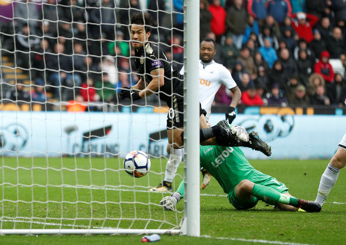 Soccer Football - Premier League - Swansea City vs Leicester City - Liberty Stadium, Swansea, Britain - October 21, 2017 Leicester City's Shinji Okazaki scores their second goal Action Images via Reuters/John Sibley