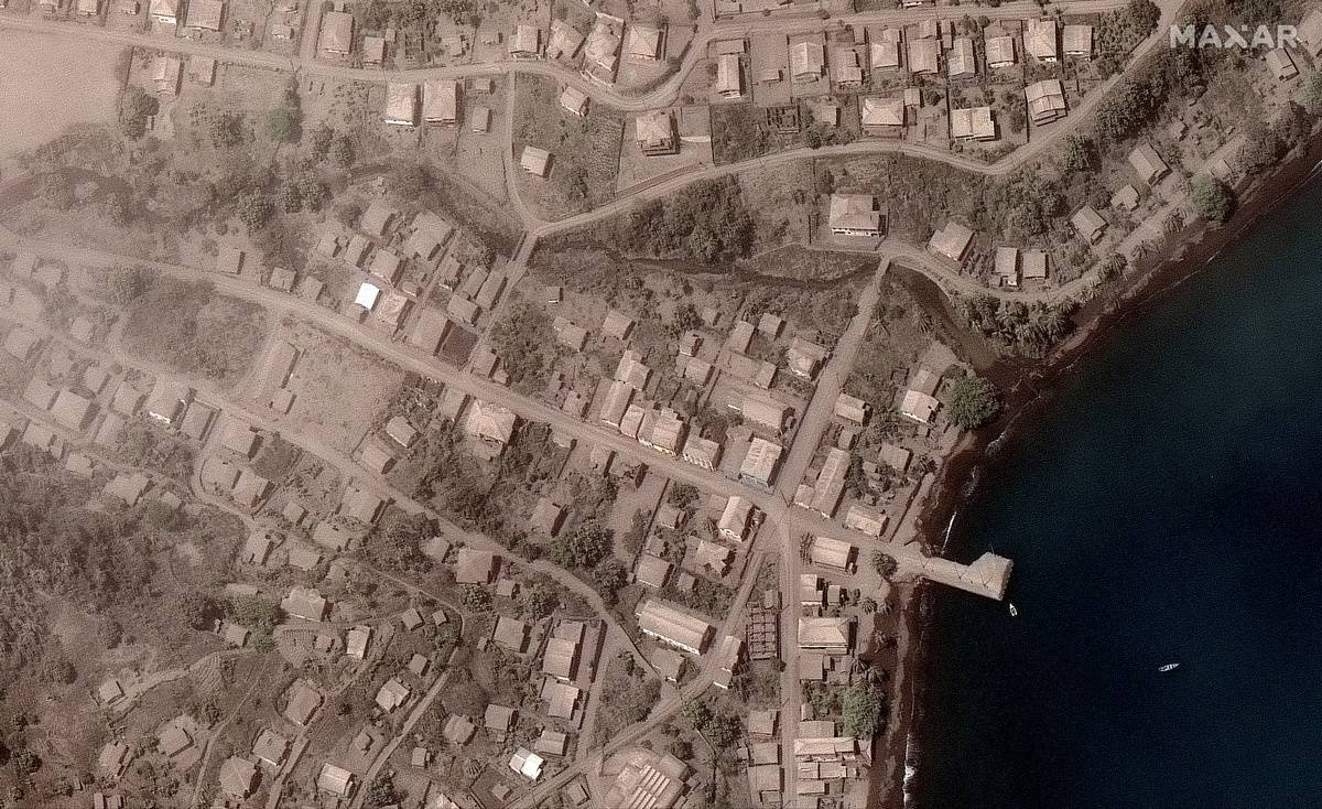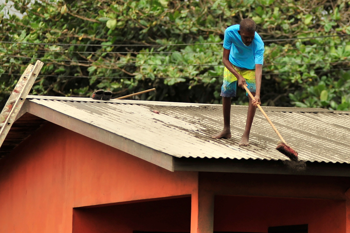 Ash blankets much of the island, as thick as 8 inches (20 cm) in some parts. It has destroyed crops, contaminated water, killed animals and devastated infrastructure, also rendering some roads impassable, complicating search and rescue efforts.