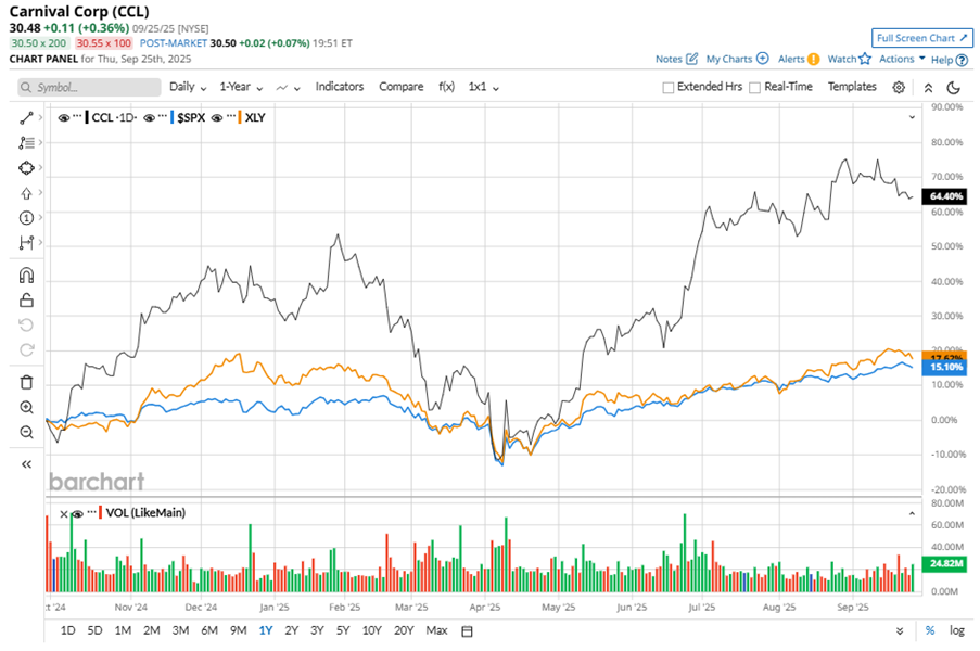 CCL stock has considerably outperformed the S&P 500 Index’s ($SPX) 15.4% gains over the past 52 weeks, with shares up 69% during this period. Similarly, it considerably outperformed the Consumer Discretionary Select Sector SPDR Fund’s (XLY) 18.3% gains over the same time frame.