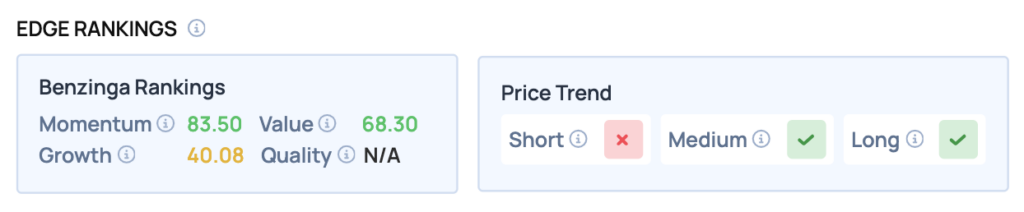 Benzinga Edge Rankings: According to Benzinga Edge rankings, the stock shows strong Momentum with a score of 83.50, but weak Growth prospects at just 40.08.
