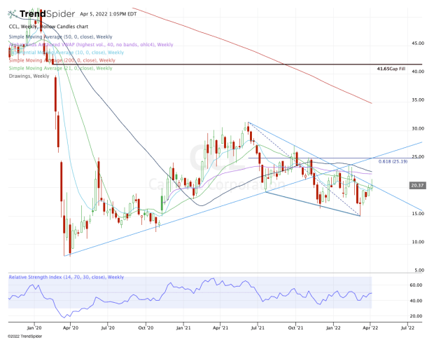 Now we’re in a tough spot — which is not what traders like. They like clearly defined risk/reward setups. In the case of Carnival, we don’t have that, but we could if it finishes this week strong.