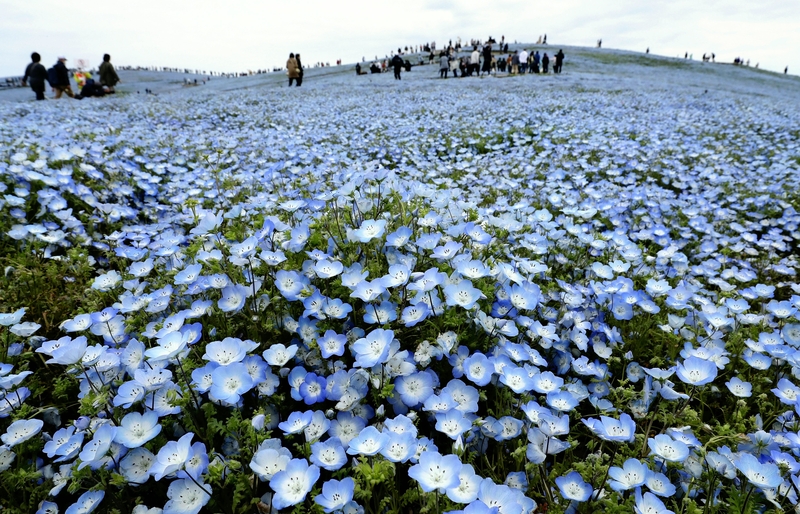Visitors walk through a field of nemophila flowers in full bloom at Hitachi Seaside Park in Hitachinaka, Ibaraki Prefecture, on Friday.