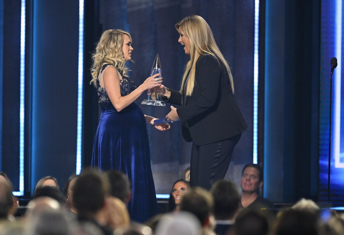52nd Country Music Association Awards - Show - Nashville, Tennessee, U.S., 14/11/2018 - Female Vocalist of The Year winner - Carrie Underwood receives award from Trisha Yearwood. REUTERS/Harrison Mcclary