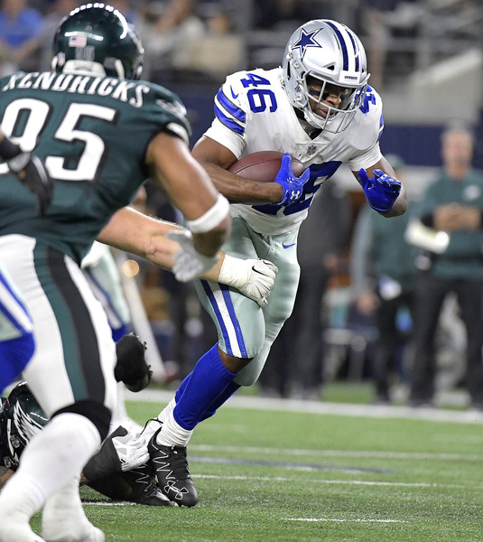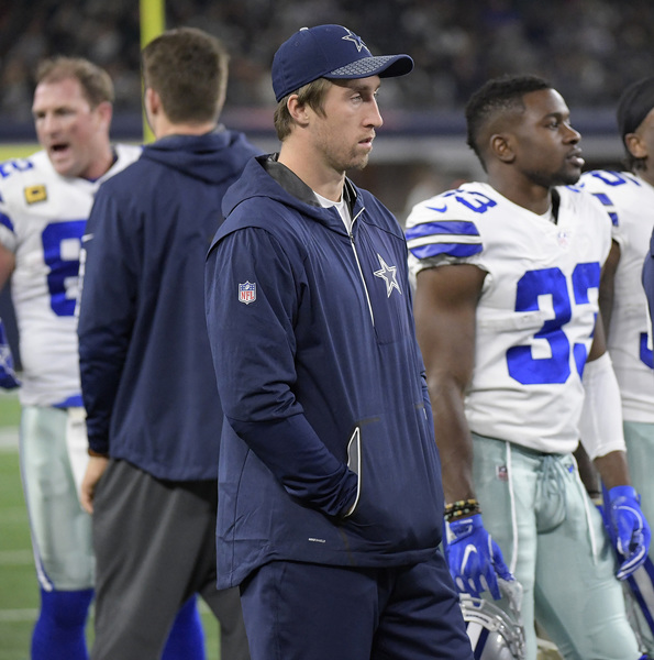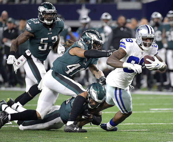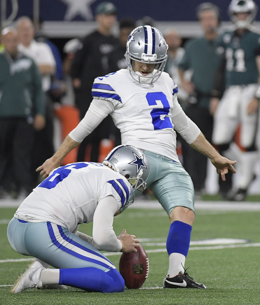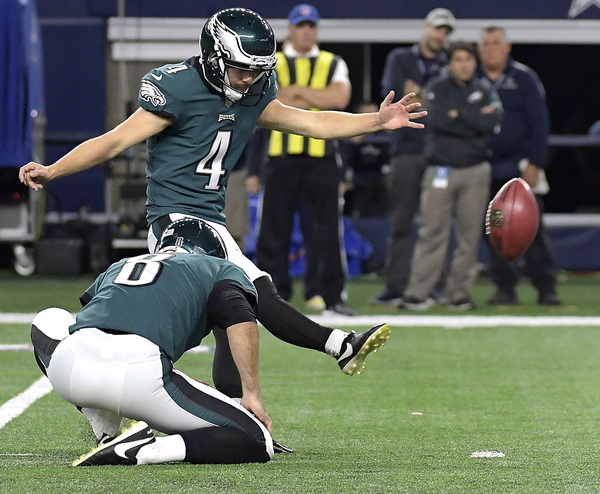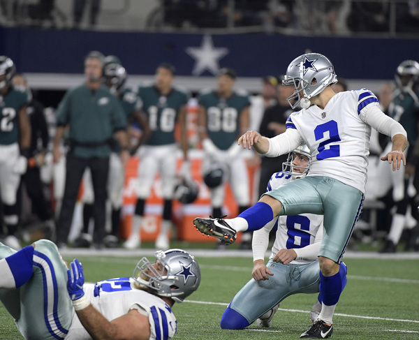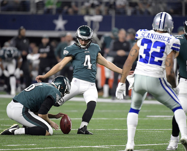 The opening kickoff doesn't usually produce suspense, but it did Sunday. Ryan Switzer returned Elliott's kick 61 yards, with Elliott the one who tackled him. Elliott's helmet appeared to collide with Switzer's on the play, and he later left the game with a concussion. That left the Eagles without a kicker for three quarters; linebacker Kamu Grugier-Hill took over kickoffs. The Cowboys showed Switzer's return on their enormous video screen during the fourth quarter as the play of the game, which shows what kind of game it was for Dallas.