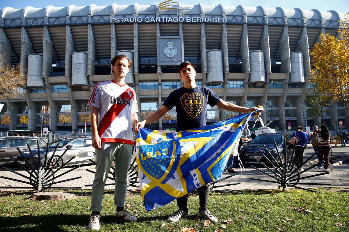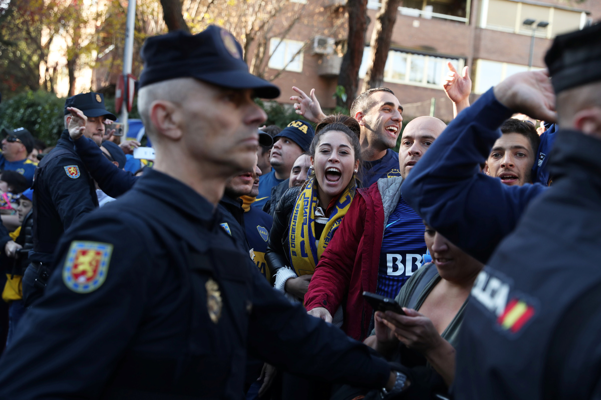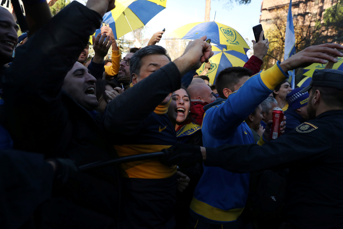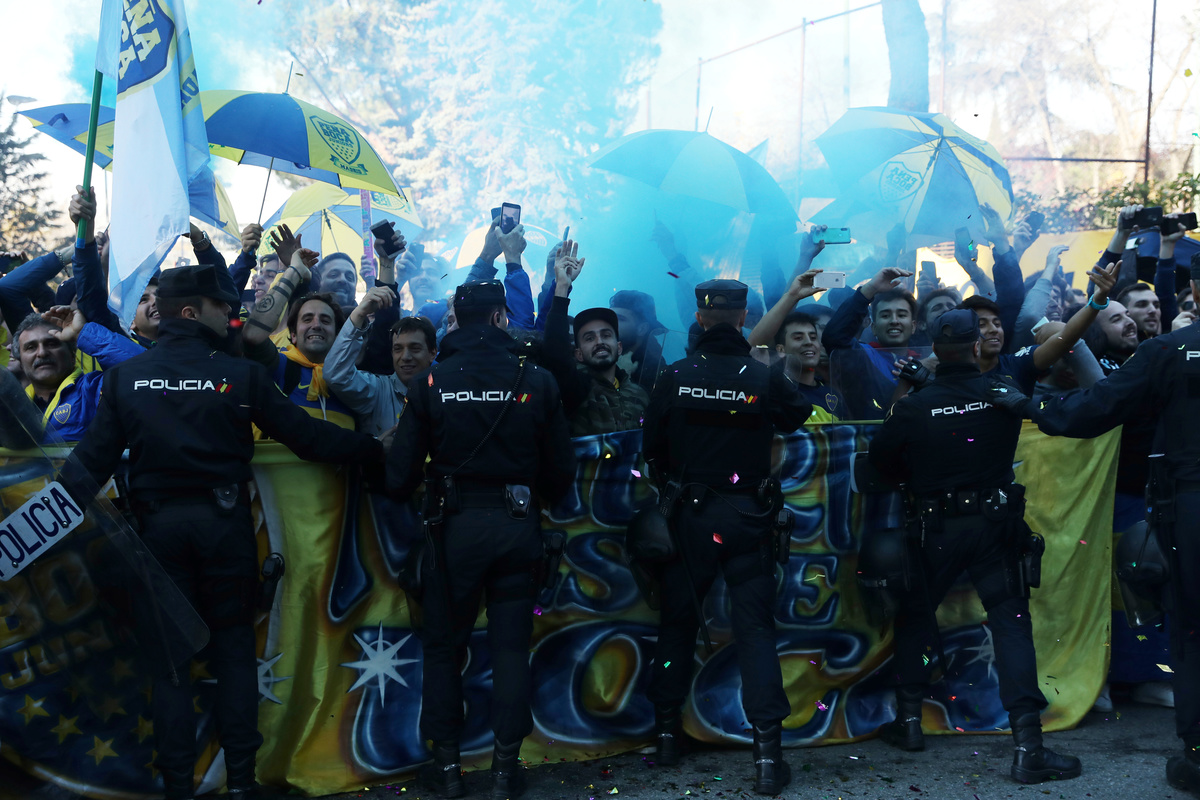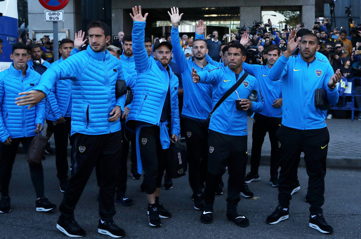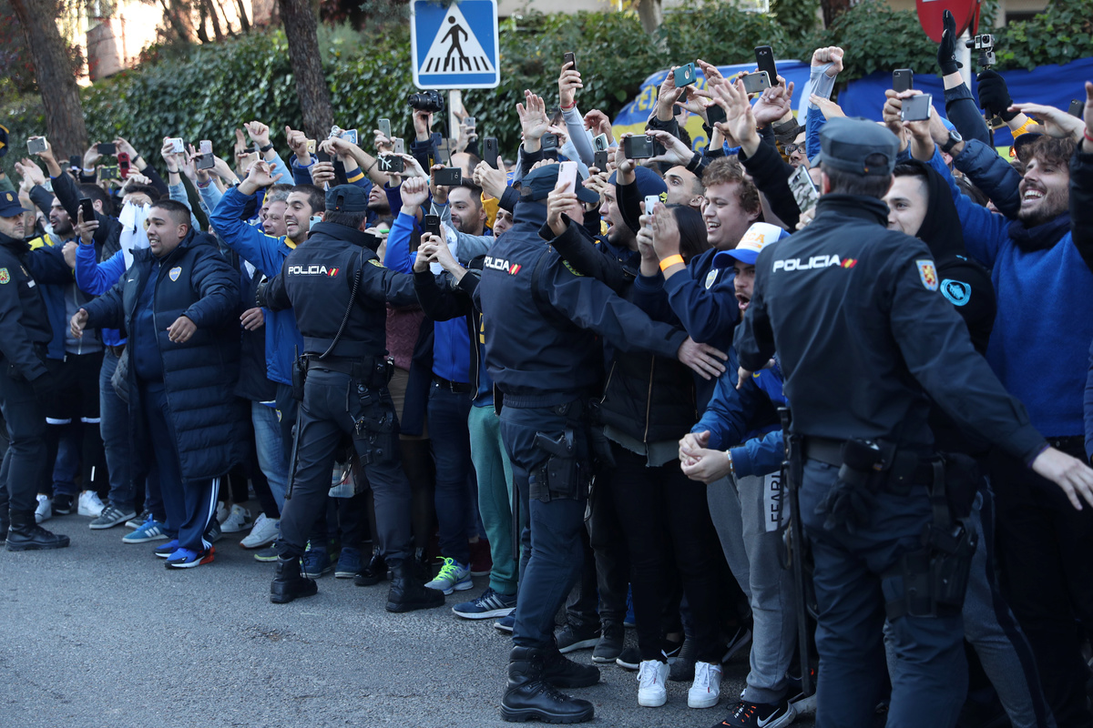 Soccer Football - Boca Juniors Fans ahead of the Copa Libertadores match between River Plate and Boca Juniors - Eurostars Suites Mirasierra, Madrid, Spain - December 8, 2018 Boca Juniors fans and police outside the team hotel as the Boca Juniors team coach arrives REUTERS/Susana VeraSoccer Football - Boca Juniors Fans ahead of the Copa Libertadores match between River Plate and Boca Juniors - Eurostars Suites Mirasierra, Madrid, Spain - December 8, 2018 Boca Juniors fans and police outside the team hotel as the Boca Juniors team coach arrives REUTERS/Susana VeraSoccer Football - Boca Juniors Fans ahead of the Copa Libertadores match between River Plate and Boca Juniors - Eurostars Suites Mirasierra, Madrid, Spain - December 8, 2018 General view as the Boca Juniors team coach arrives at the team hotel REUTERS/Susana VeraFILE PHOTO: German Lopez, River Plate fan, poses with his brother Gonzalo Lopez, Boca Junior fan, in front of Santiago Bernabeu Stadium, in Madrid, Spain December 7, 2018. REUTERS/Javier Barbancho/File PhotoSoccer Football - Boca Juniors Fans ahead of the Copa Libertadores match between River Plate and Boca Juniors - Eurostars Suites Mirasierra, Madrid, Spain - December 8, 2018 Boca Juniors' Carlos Tevez and team mates applaud and wave to their fans outside the team hotel REUTERS/Susana VeraSoccer Football - Boca Juniors Fans ahead of the Copa Libertadores match between River Plate and Boca Juniors - Eurostars Suites Mirasierra, Madrid, Spain - December 8, 2018 Boca Juniors fans and police outside the team hotel as the Boca Juniors team coach arrives REUTERS/Susana VeraSoccer Football - Boca Juniors Fans ahead of the Copa Libertadores match between River Plate and Boca Juniors - Eurostars Suites Mirasierra, Madrid, Spain - December 8, 2018 Boca Juniors fans and police outside the team hotel as they await the arrival of the Boca Juniors team coach REUTERS/Susana VeraSoccer Football - Boca Juniors Fans ahead of the Copa Libertadores match between River Plate and Boca Juniors - Eurostars Suites Mirasierra, Madrid, Spain - December 8, 2018 Boca Juniors fans and police outside the team hotel as they await the arrival of the Boca Juniors team coach REUTERS/Susana Vera