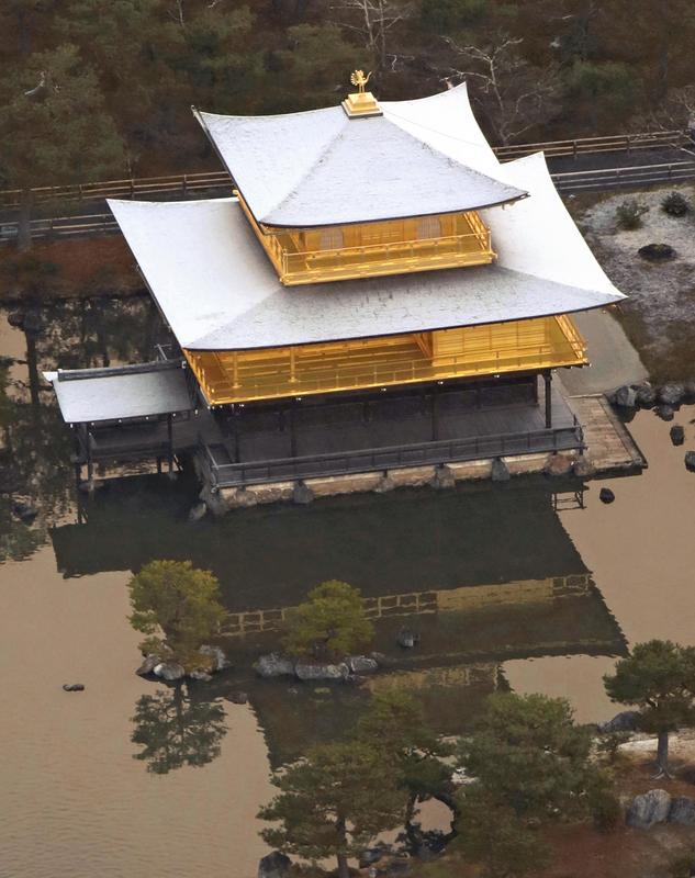 In Kyoto, the roofs of Kinkakuji temple were covered with a thin layer of snow Friday morning. The city saw snowfall for the second time this winter, with the first snow of the season coming Dec. 9.