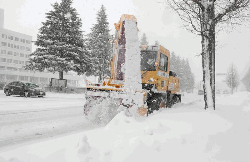 A snow plow removes snow from the street in Yonezawa, Yamagata Prefecture, on Friday morning. The coldest air to arrive in Japan this winter brought snow to areas along the Sea of Japan and in mountains, with the first snow of the season observed at 11 locations, including Osaka, Saga and Tsu.
