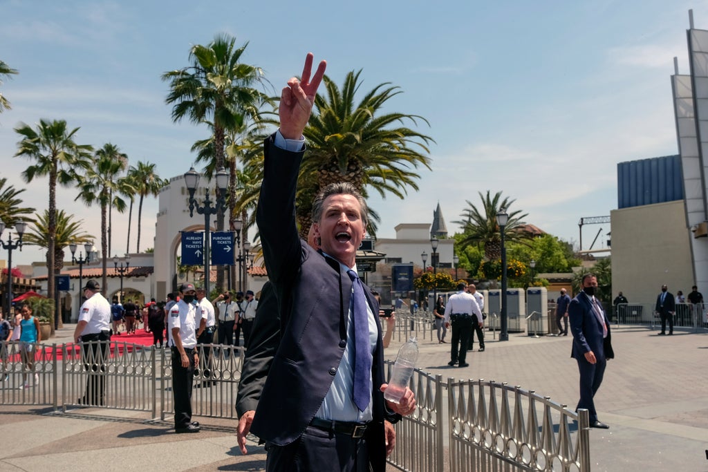 The spot is one of three now airing statewide on television, though the other two are negative, painting a dark picture of Republicans behind the effort. Their release follows two weeks of Newsom traveling the state as game show host, appearing at theme parks to award millions of dollars in prize money for vaccinations and to celebrate the end of most pandemic-related restrictions.