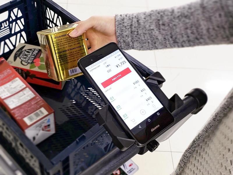 Shoppers scan the bar code on each item they want to buy with a smartphone app before putting it in their shopping baskets. When they finish shopping, they touch a "purchase" button on the app to pay with a preregistered credit card. Shoppers need only to show a confirmation screen as they exit the store.