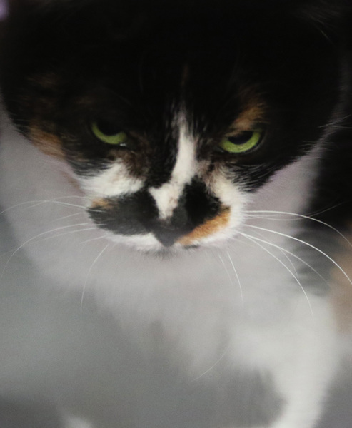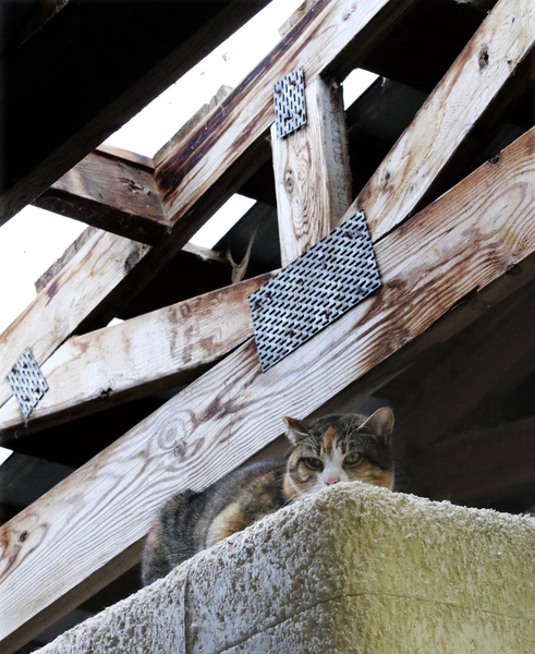 We are standing on the street, talking about the cat named "Tor" by his new owners, when Horton glimpses a flash out the corner of her eye. I see nothing. The house two doors down has a "For Sale" sign out front, and as we follow her sighting, around the side of the empty house, she nudges her toe into a cat door that has been blocked by a stiff piece of plastic.