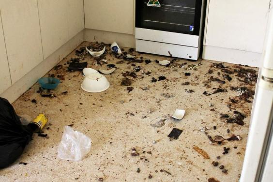 Graphic footage shows shocked inspectors wading through detritus, including faeces, empty bowls and even furniture, as Trooper can be heard wailing in the background.