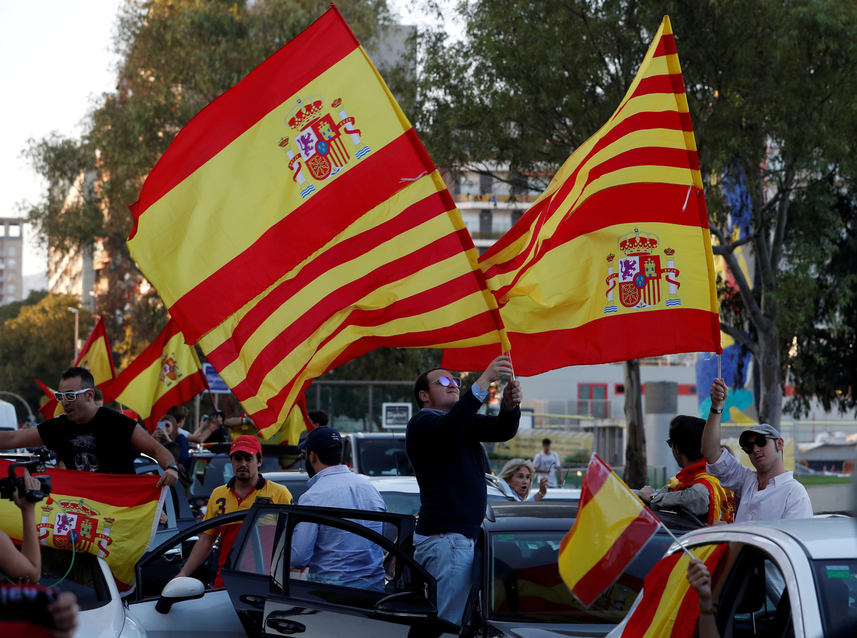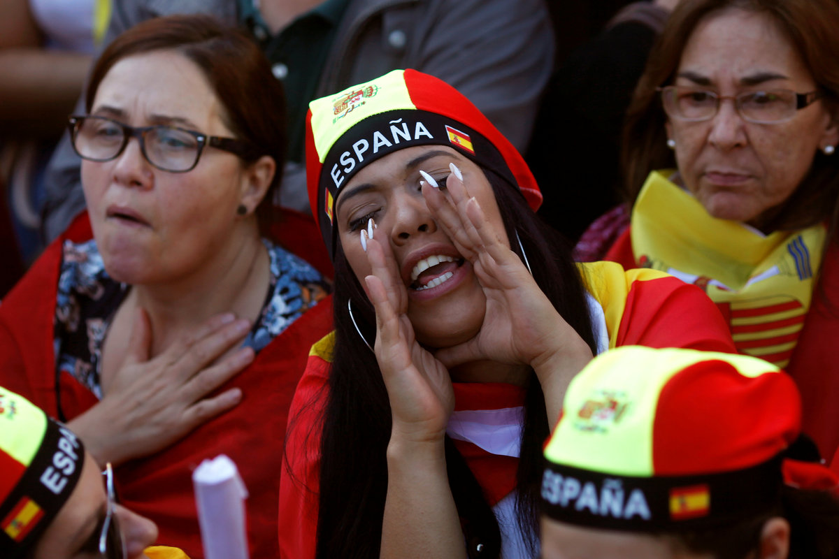 Waving thousands of Spanish flags and singing "Viva España", protesters on Sunday turned out in the largest display of support for a united Spain since the beginning of the crisis -- underlining the depth of division in Catalonia itself.