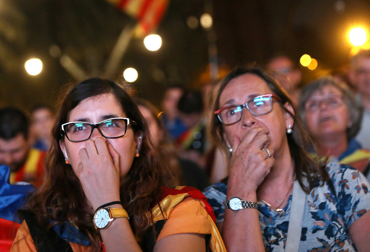 Independence supporters watched Puigdemont's speech on large screens outside the 18th-century parliament building. Initially, people chanted "independence", cheered and kissed each other, but as it became clear there would be no formal declaration of independence, some people whistled and shook their heads.