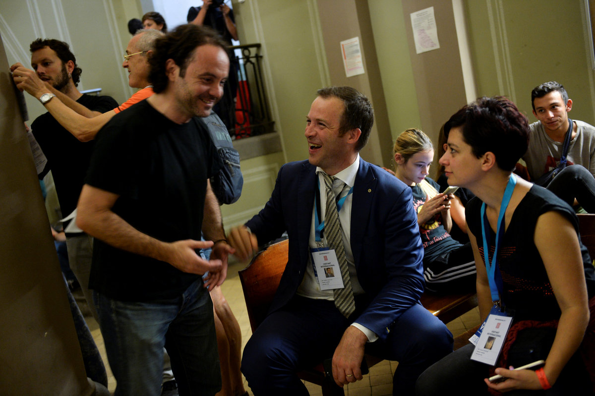 International observers Ilaria Brunelli (R) and Andrea Favaro (C) from Italy speak to a man inside the Miquel Tarradell high school, which is a polling station for the banned independence referendum, in Barcelona, Spain, October 1, 2017. REUTERS/Eloy Alonso
